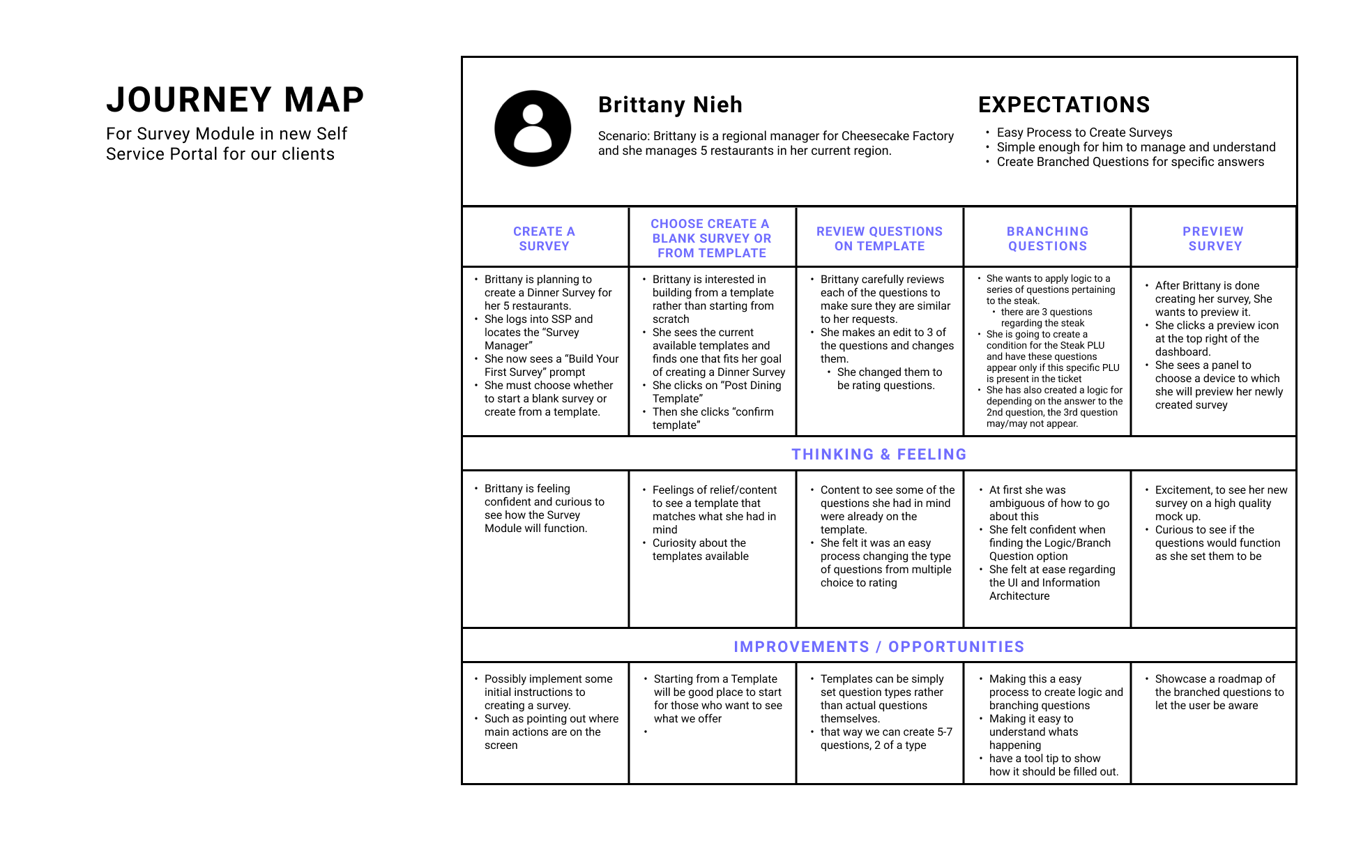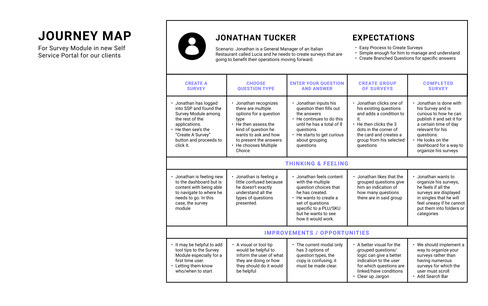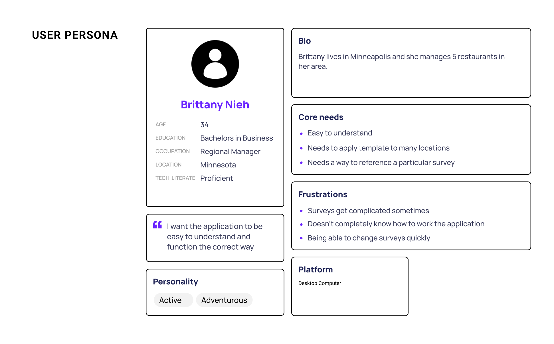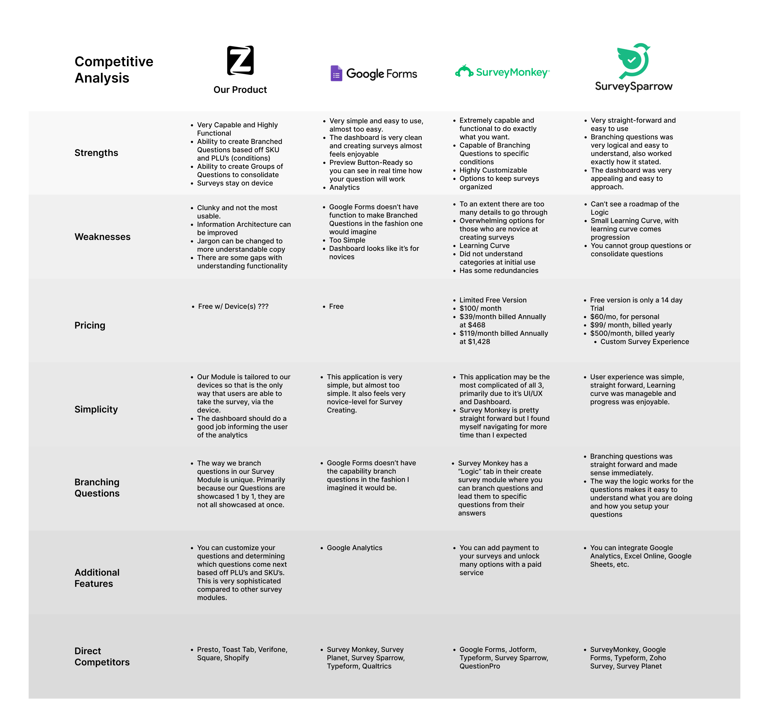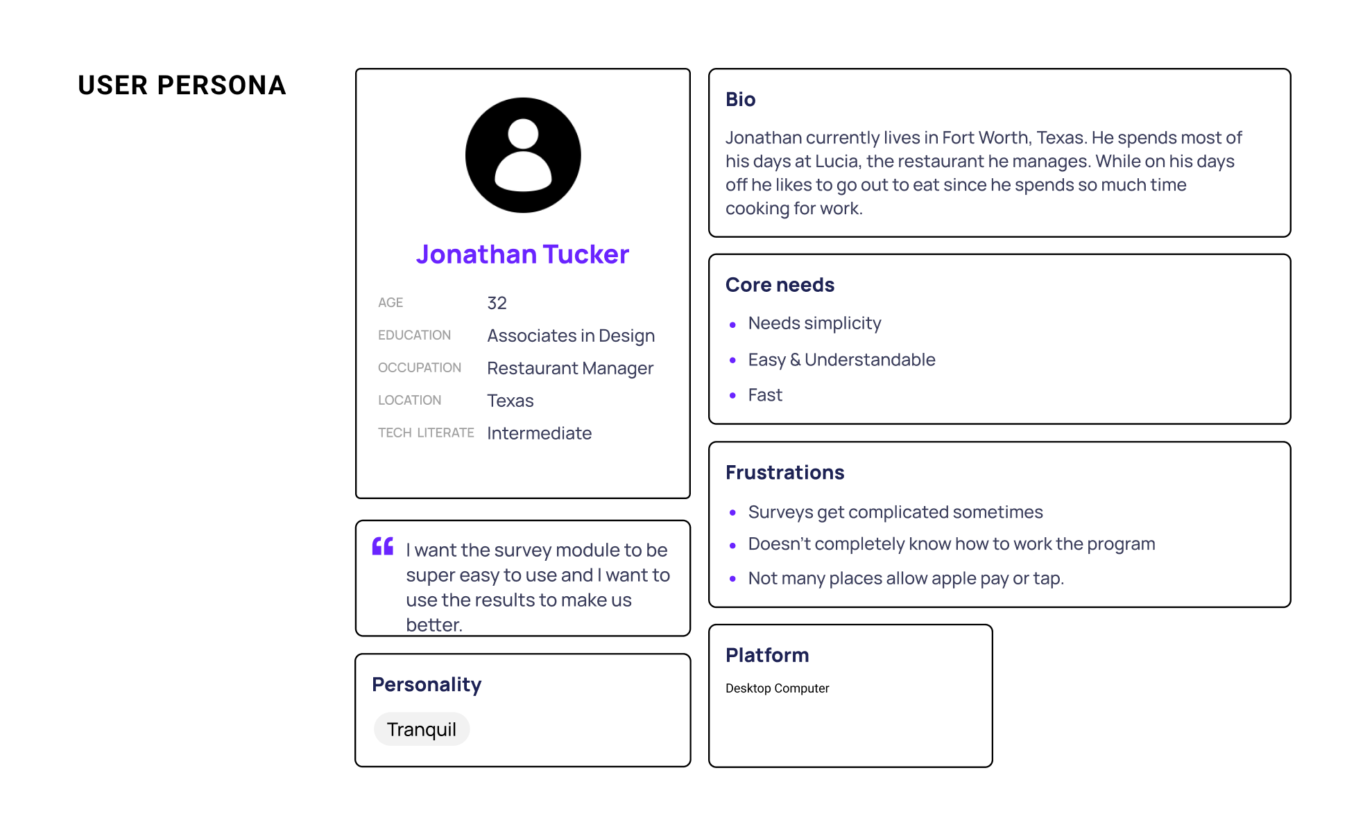 Goal: Create a brand new Survey module with cutting edge usability standards along with making a visually appealing tool that can be easy for small and large clients to use so they can gather consumer data from their customers at their establishments.